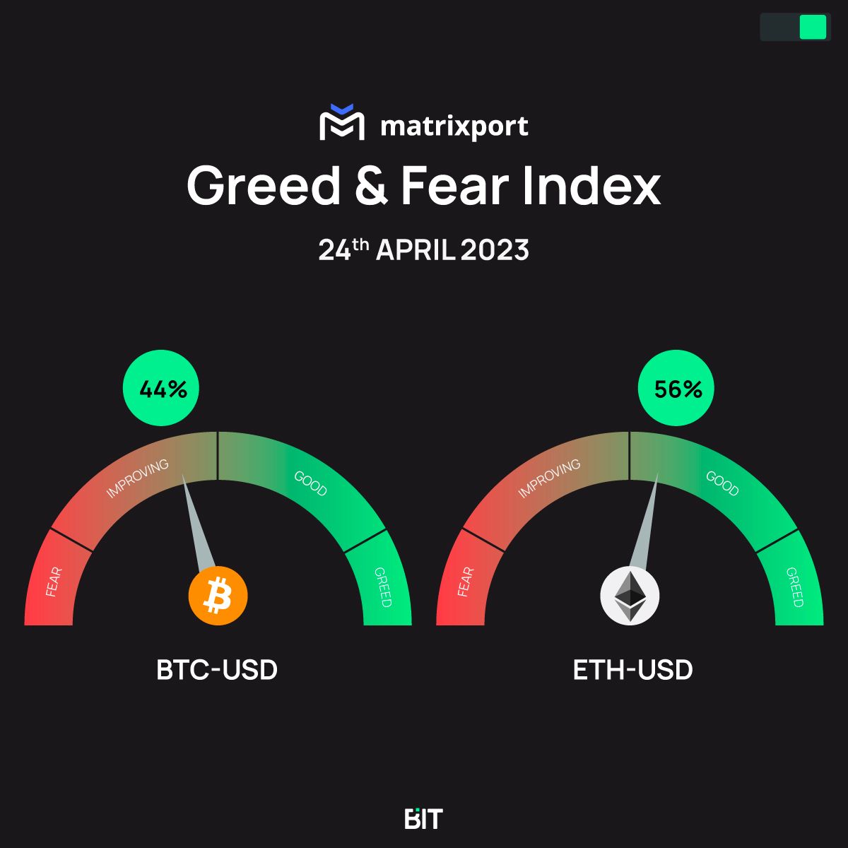 - Our Greed & Fear Index prints 44%, while the Ethereum Greed & Fear Index prints 56%. The RSI for Bitcoin is 43% while the Ethereum RSI is at 49%.