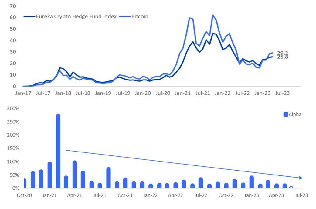 1) According to the Eurekahedge Cryptocurrency Index, a benchmark index with 14 equal-weighted constituents, crypto HFs are underperforming Bitcoin for the 5th year out of the last 8 years. This is a very poor representation of crypto fund managers. Even in 2023, they have underperformed in Jan and Mar — both months saw Bitcoin returns of +39% & +23% returns.
