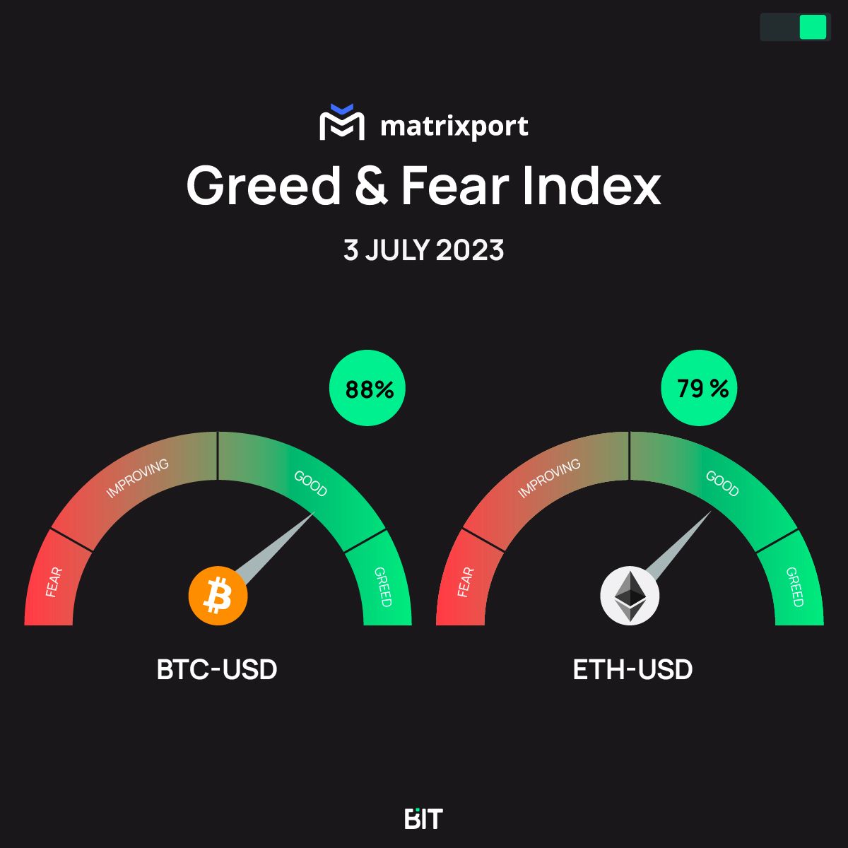 5) Our MP Greed & Fear index for Ethereum trades at 79%. During the mid-June 2023 lows, we got a buy signal (<10%) when Ethereum traded at 1,700. Now at 1,920, prices have rallied, but we think the chance for an explosive move higher has arrived.