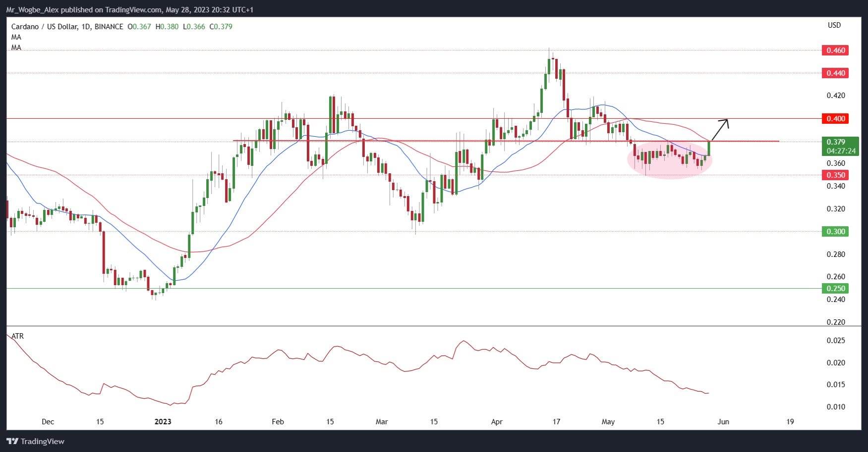 Shifting our attention to the price of ADA, the cryptocurrency has recorded a modest recovery from its recent drop near the $0.350 support area. As of the time of writing, ADA sits on a 3.2% increase over the past 24 hours, bringing it to the doorstep of the critical $0.380 resistance level. This price point has kept ADA subdued through May, and now, a few days before the end of the month, the cryptocurrency faces the chance to lift this ceiling.