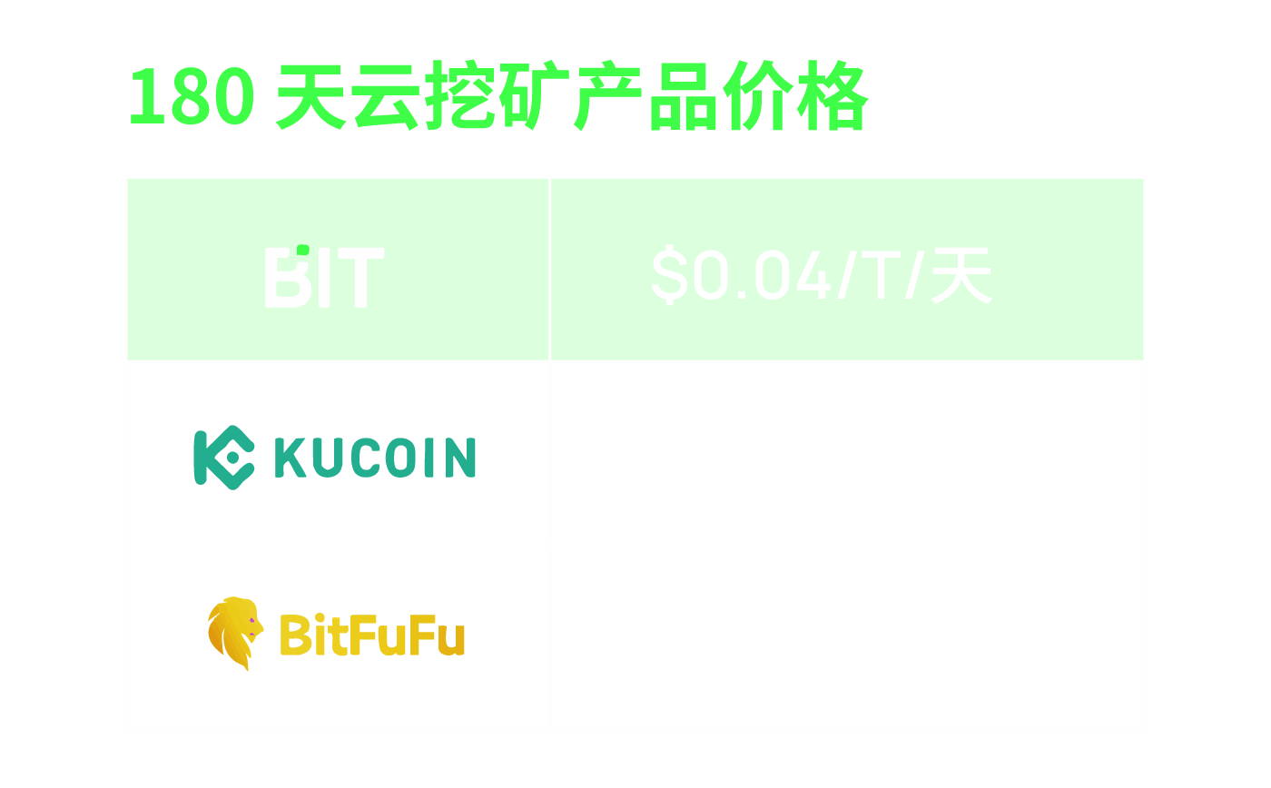 本周,BTC价格下跌,导致云挖矿市场情绪更加谨慎。市场上180天云挖矿名义报价中位数仍保持约$0.0469/T/天。以180天产品为例,若投资者在Bit平台购买180天周期的云挖矿产品,挖矿价格为$0.04/T/天。同时,Bit推出获币成本低于$10万的限时特惠产品。