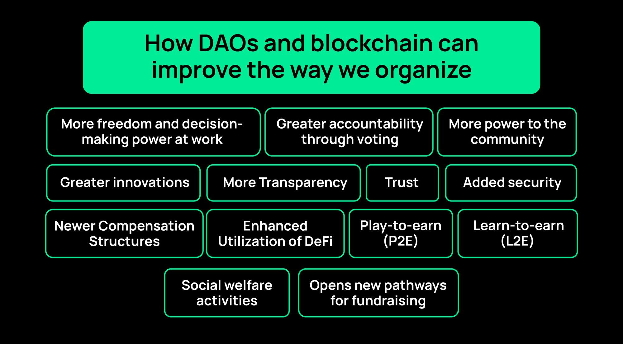 DAOs introduce new ways to organize your community. In DAOs, the community benefits from transparent organization, easier fundraising, and serving essential needs. For example, imagine your local municipal government forming a DAO to organize local projects. Thanks to the DAO's structure, everyone in your local community will have an equal role in its activities.