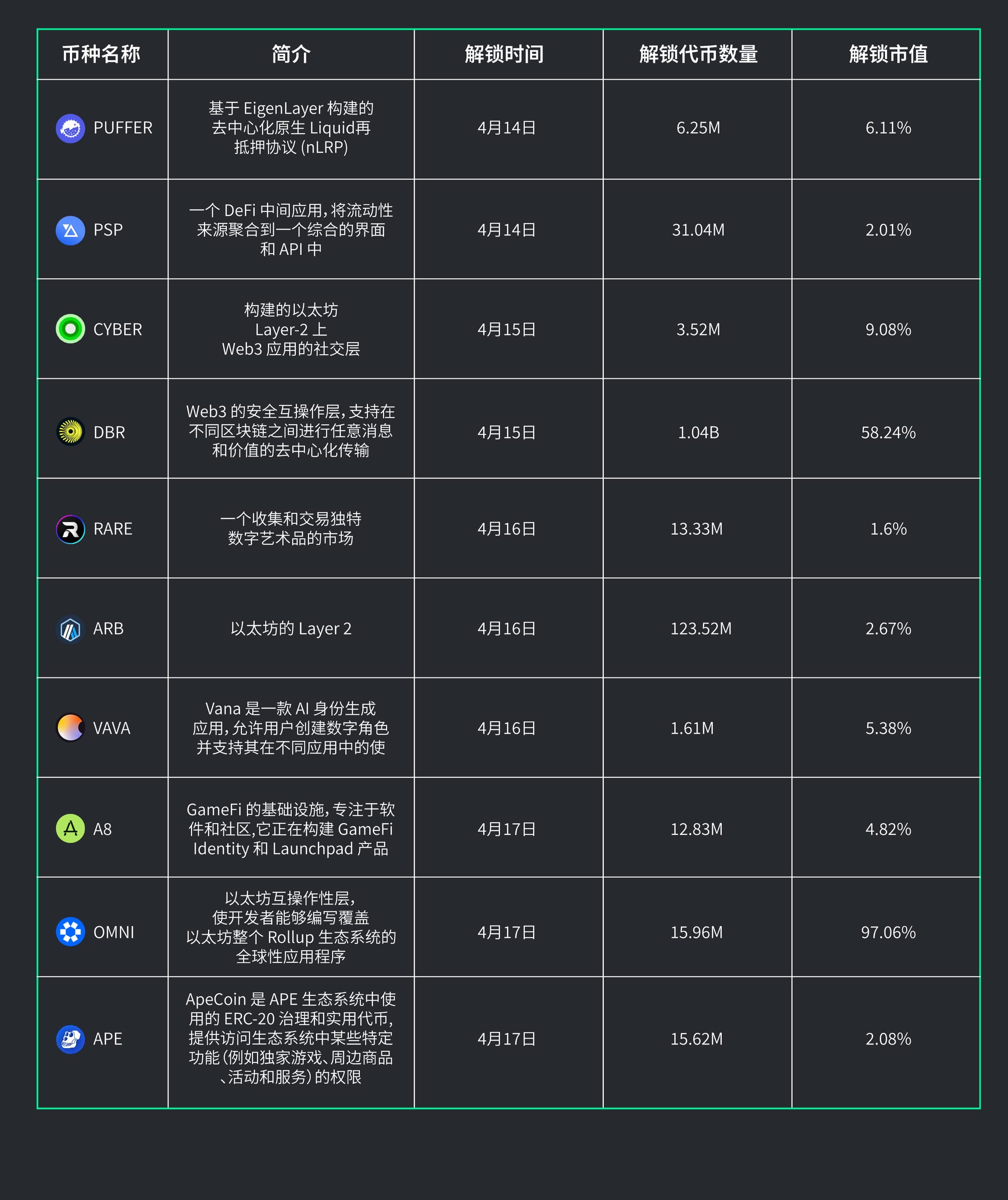三、下周即将解锁的代币: