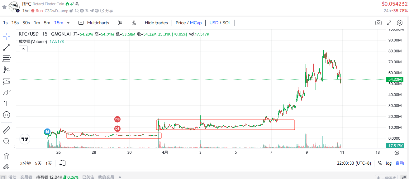 图表中展现出标准的两段吸筹,配合RFC热度发酵顺势拉盘。在惨淡二级下链上依旧存在机会,市值能达到80m也代表了链上一部分流动性的回归,可以慢慢在链上抄底一些基本面不错但超跌的代币。