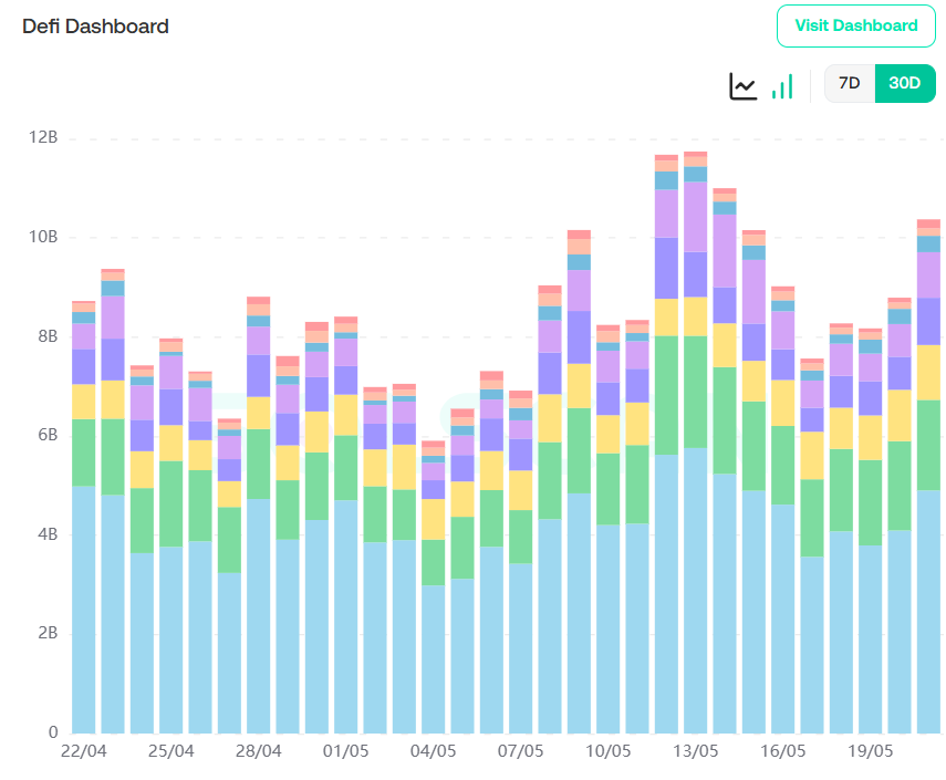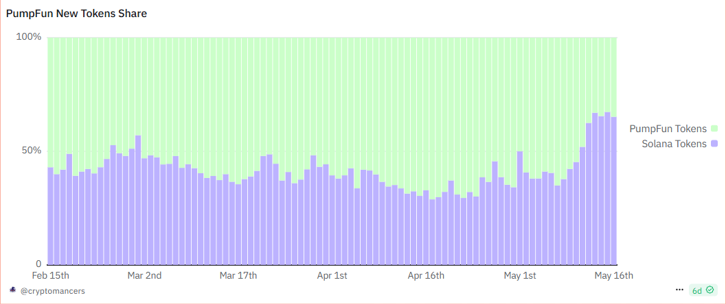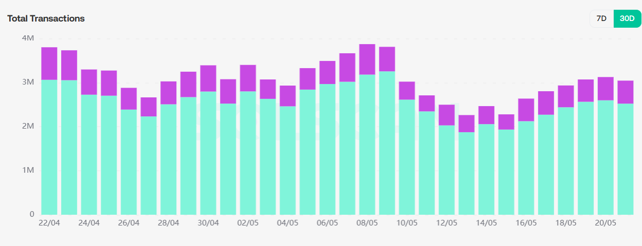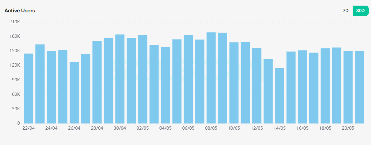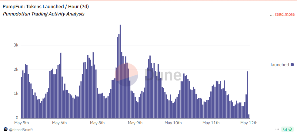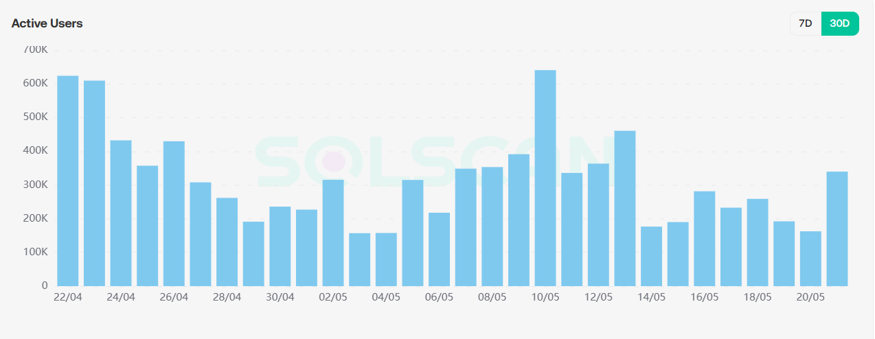从pump.fun数据可以看到,总交易额依旧呈现上升趋势,活跃账户总体保持在150K,说明meme投资者依旧保持活跃。总交易哈希数保持上升趋势,在上周believe,bonk,pump.fun三大发射台混战后(详见5月16日周报分析),pump.fun交易活跃度回暖。