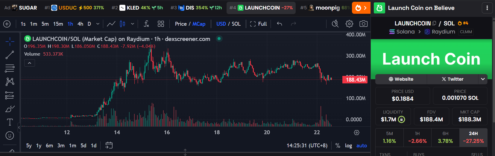上周大热的believe发射台官方代币Launchcoin在本周迎来超过50%的下跌,同时相关代币Goonc、Dupe均面临下跌,同时警示对于一级代币投资不建议进行进行抄底行为。