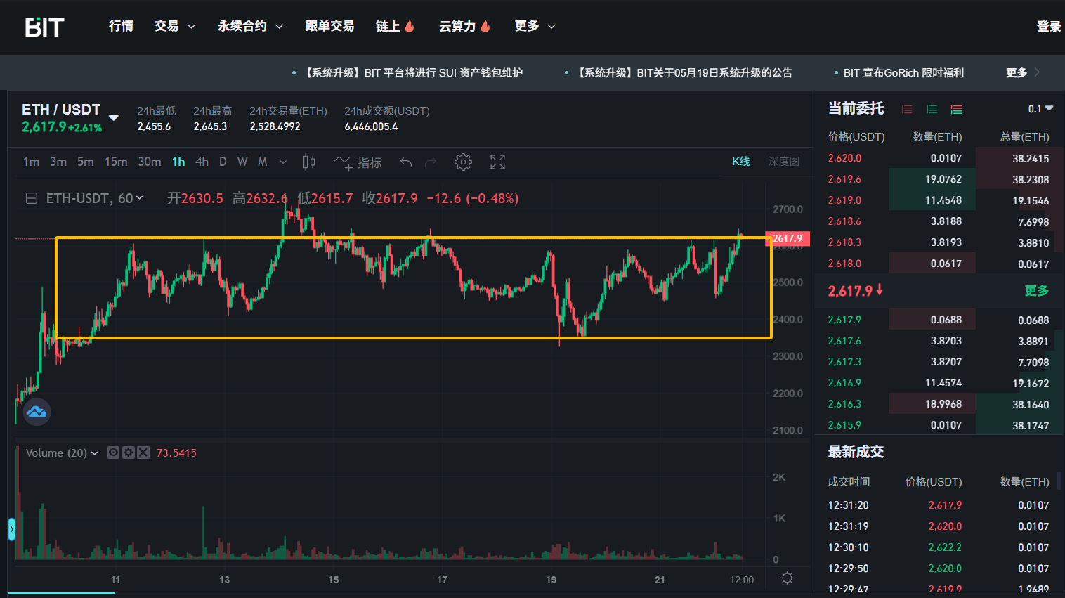 可以看到以太坊在上周逼近2700美金后随及回落,本周跟随比特币的走势展现出高波动性,但在比特币新高之际仍仅仅到达箱体顶端。