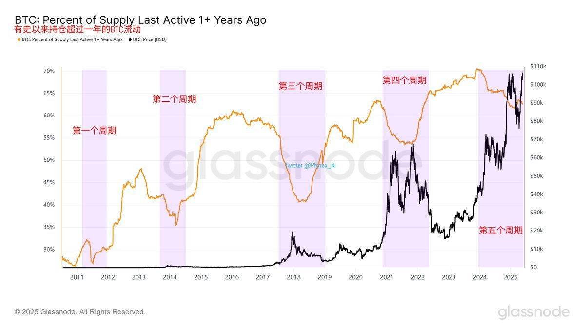 从以往数据显示,每当比特币达到历史高点时,长期持仓比特币会进入派发阶段,即持仓量下降;从当前持仓结构来看仍处于派发阶段,追高需谨慎。