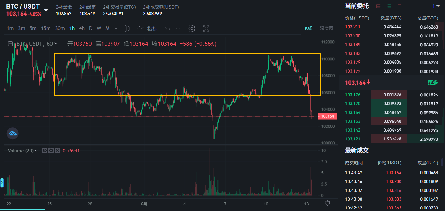 尽管美国股市能够摆脱这些头条新闻并小幅上涨,但加密货币就没那么幸运了,市场恐慌情绪蔓延。可以看到在13日,比特币单日下跌超3%,当前报价10万3千美金。参考以往,在2024年7月中东战争时,加密市场单日下跌8%,单日振幅18%,以此形成市场底部。