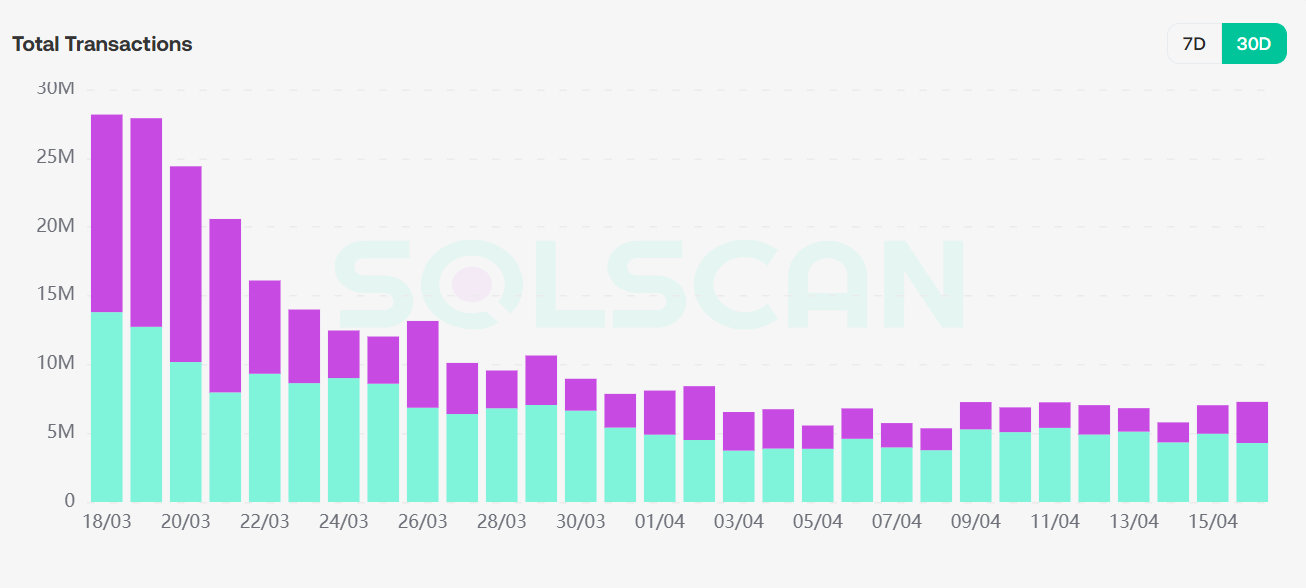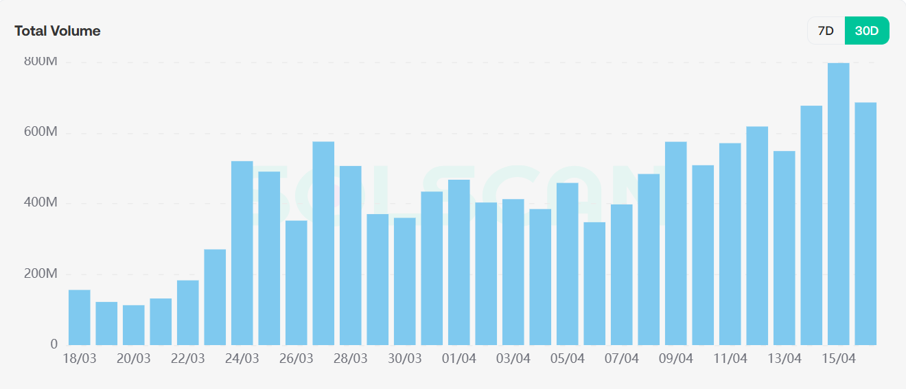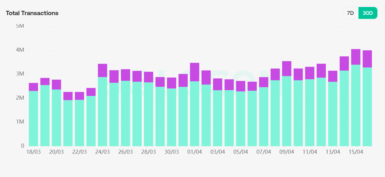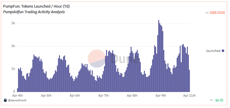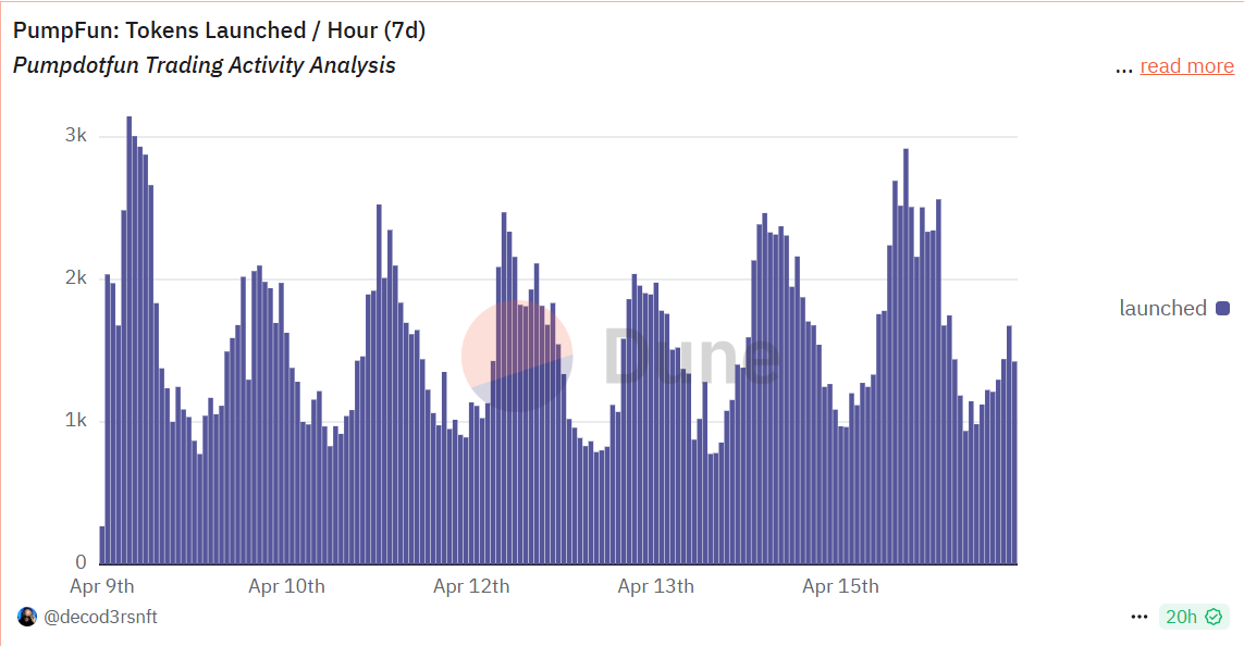 从pump.fun的数据来看,总交易量和交易笔数均呈现上升趋势,交易量较上周提升增加一倍,最多在4月15日8亿美金;交易哈希数相较于上周上涨超50%,表现出链上炒作meme的情绪和资金均有提升。但活跃用户数并未随资金上升,或许意味着更多的链上用户持观望态度。
