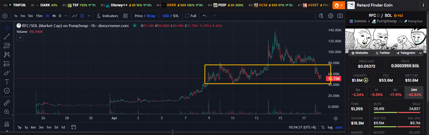 在本周链上出现两只现象级别代币,rfc经过三周时间上涨,市值成功突破100m,最高市值达到140m。为自川普宣布关税政策后solana上第一支市值超过1亿美金的代币。