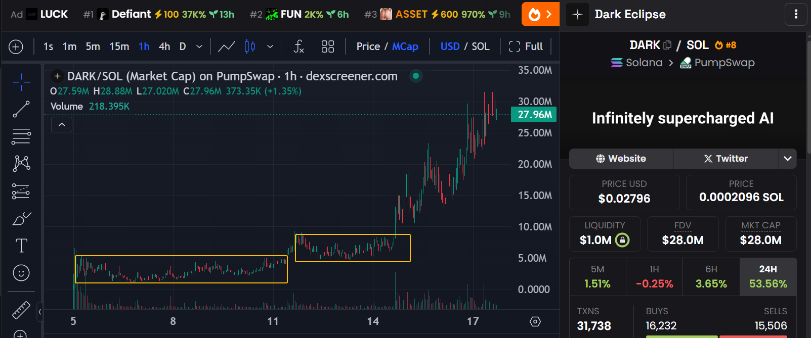 另一只代币dark,mtndao联创@edgarpavlovsky正在开发的AI competitive游戏,采用 Model Context Protocols(MCP)开源框架增强 AI 能力。该代币标准的盘整突破结构,自发射后在3m-5m横盘6天,5m-8m横盘3天,目前已上涨至30m,仍有望冲击50m。该代币目前是近期最强的AI概念币,某种程度也是当前市场资金的渴望,他的市值空间也将意味着AI行情是否回归。