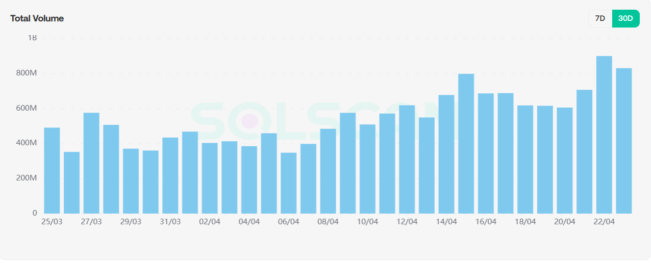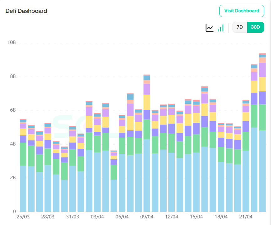 可以看到solana链上Defi协议交易哈希在本周较上周基本保持持平;但值得关注的是总交易量较上周迎来巨幅提升,总额已经达到9B左右,较上周提升超过50%,虽然Defi协议笔数未增加,从交易额上可以看到投资者们对solana后市行情看好,在sol生态也投入了更多资金。