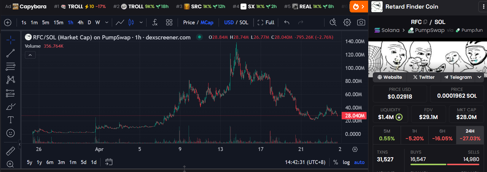 从代币部署量来看,本周代币部署量较上周总体处于持平状态,峰值在3k左右。代币部署跟链上热度紧密相关,虽然本周链上活跃度总体上升,但链上并未出现现象级代币。上周聊到的链上行情将与龙头市值的高度息息相关,前几周大火的rfc在本周下跌幅度超过50%,相较于高点140m,当前市值仅维持在30m左右。作为马利克相关的纯meme叙事,在马斯克停止互动后,代币热度也迎来断崖式下跌,而140m也是近三个月的新meme里的市值天花板。