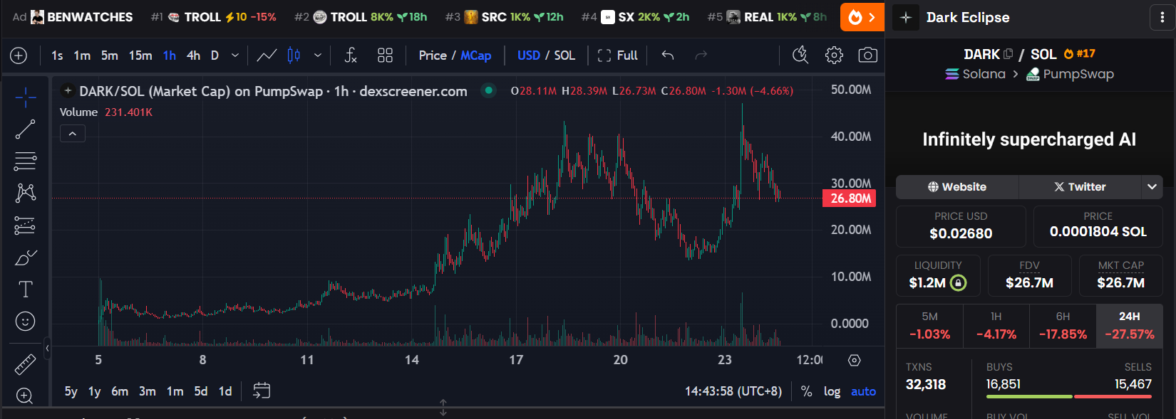 从走势上看dark十分强势,在20日走出“三顶”形态后迎来50%幅度的回调,市值一度接触到10m随后在半天的时间里拉盘至新高45m,目前回调至27m。dark的强势也带动链上“老”AI概念的meme上涨,lumo底部市值1m,最高10m,涨幅超10倍。dark在下周能否再次突破新高将决定着市场热点能否成功切换到AI概念,带动链上meme产生新的造富效应。
