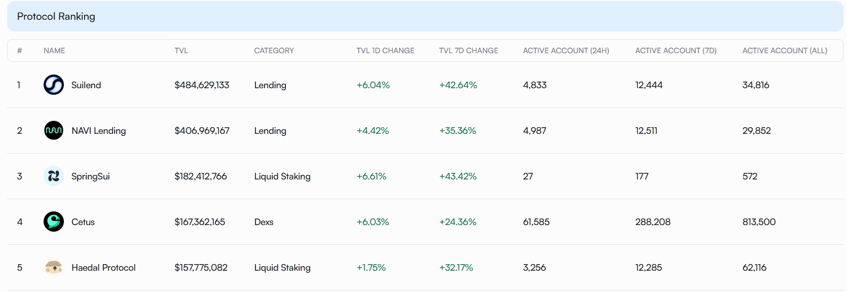 代表项目:Suilend(借贷)、NABI Lending(借贷)、SpringSui(流动性质押)、Cetus(Dex)、Haedal Protocol(流动性质押)