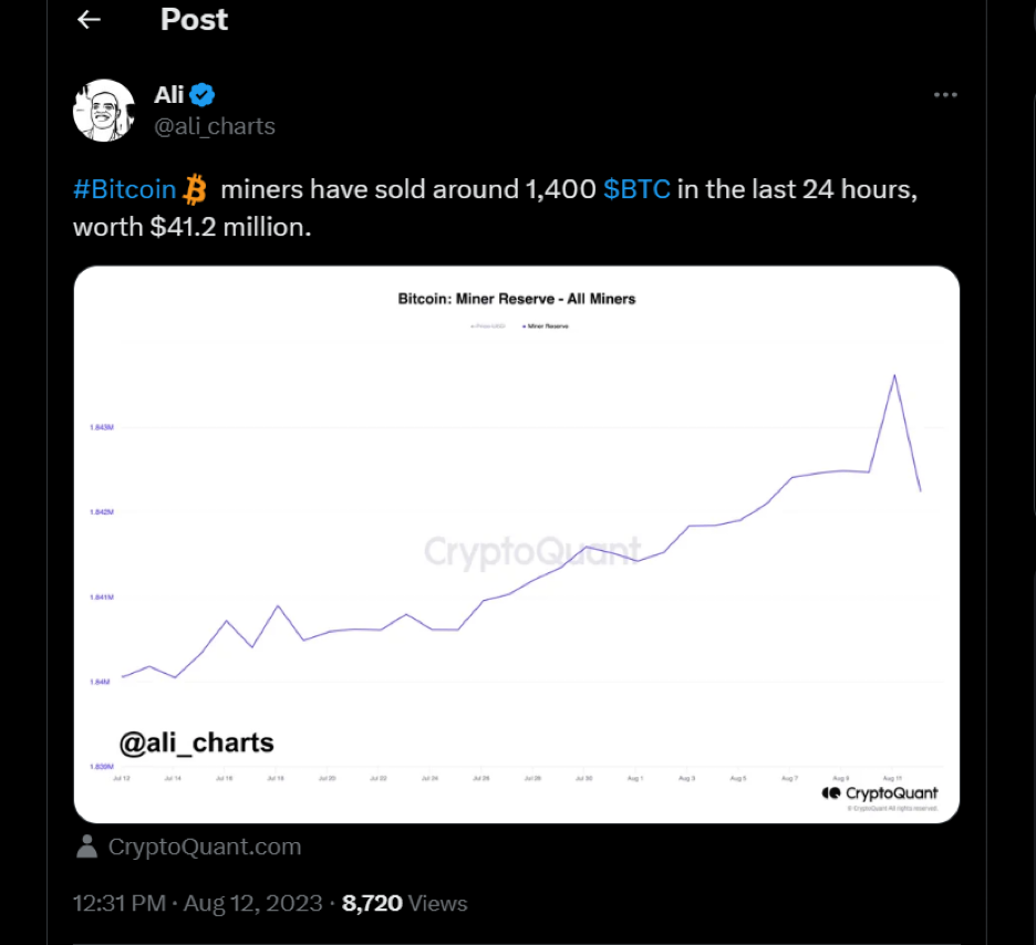 最近令人驚訝的事件引發了幣圈的關注,截至8月13日的24小時內,比特幣礦工的儲備出現顯著下降。據報導,超過1400 BTC,相當於驚人的4120萬美元被迅速出售。這意外舉措在市場中引起了騷動,讓愛好者和分析師們紛紛思考其影響。