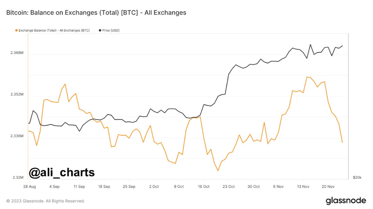 與此同時,各交易所的比特幣餘額大幅下降,表明投資者可能正在戰略性地行動,預期比特幣的價格即將飆升。