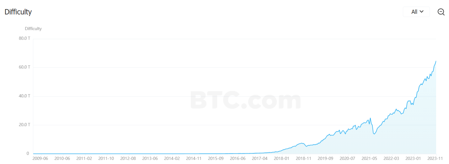 比特幣挖礦難度是衡量在區塊鏈上驗證一個區塊所需的計算工作量的重要指標,其難度值已飆升至歷史高點67.96T。這5.07%的增加發生在區塊高度818,496,標誌著挖礦難度連續第六次上升,超出了早期的預測。