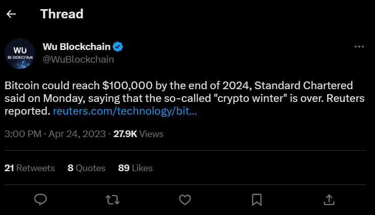 與此同時,渣打銀行也預計比特幣在未來一年內會達到六位數的價格,但原因不同。