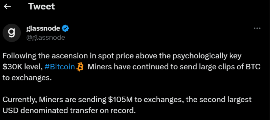 礦工現在正抓住機會鎖定收益或者準備應對預期的價格調整。因此,大量的比特幣湧入交易所已成定局,可能會在短期內對代幣價值造成下行壓力。