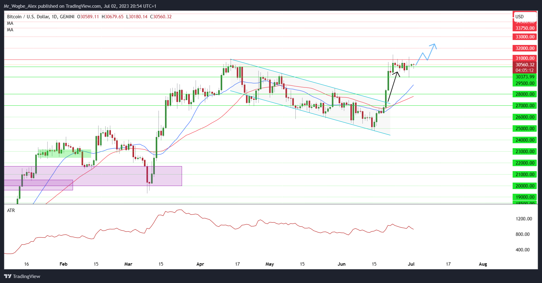 在貝萊德集團提交ETF申請後的兩週,比特幣曾飆升至31,000美元的年度高點,但現在似乎已進入區間盤整,其動能逐漸消退。正如之前提到,交易員將在未來幾天關注美國的宏觀經濟指標以確定價格走勢。