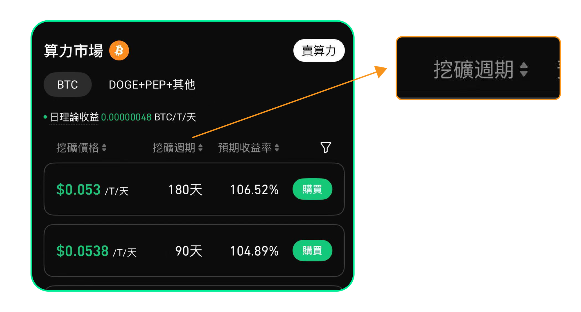 你購買雲挖礦產品的合約時間,如 30、90 或 180 天。週期越長,單價可能越低。