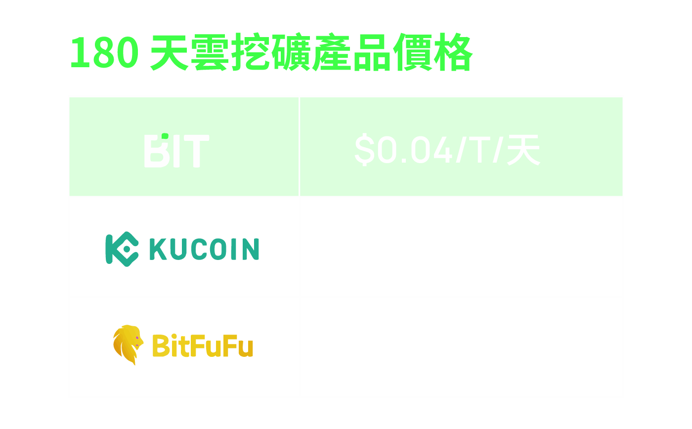 本週,BTC價格下跌,導致雲挖礦市場情緒更加謹慎。市場上180天雲挖礦名義報價中位數仍保持約$0.0469/T/天。以180天產品為例,若投資者在Bit平臺購買180天週期的雲挖礦產品,挖礦價格為$0.04/T/天。同時,Bit推出獲幣成本低於$10萬的限時特惠產品。