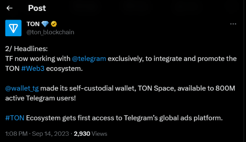 The Open Network(TON)是一個Layer-1區塊鏈平台,旨在通過Telegram簡化加密貨幣交易。Telegram是擁有超過8億用戶的熱門通訊應用程式。在過去一週,TON宣布與Telegram的合作夥伴關係後,推動其原生代幣Toncoin(TON)的價格驚人地上漲了32%。