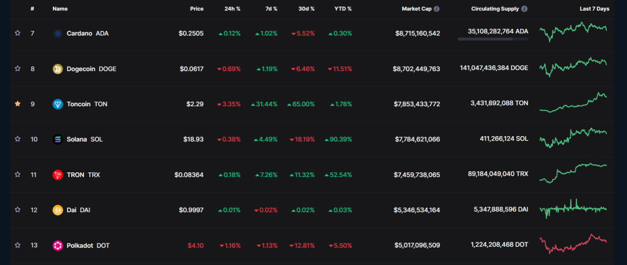 TON的劇烈上漲已經將其推到了加密貨幣排行榜的第九位,超過了像Solana(SOL)、Tron(TRX)、Polkadot(DOT)、Polygon(MATIC)和Litecoin(LTC)這些加密貨幣巨頭。