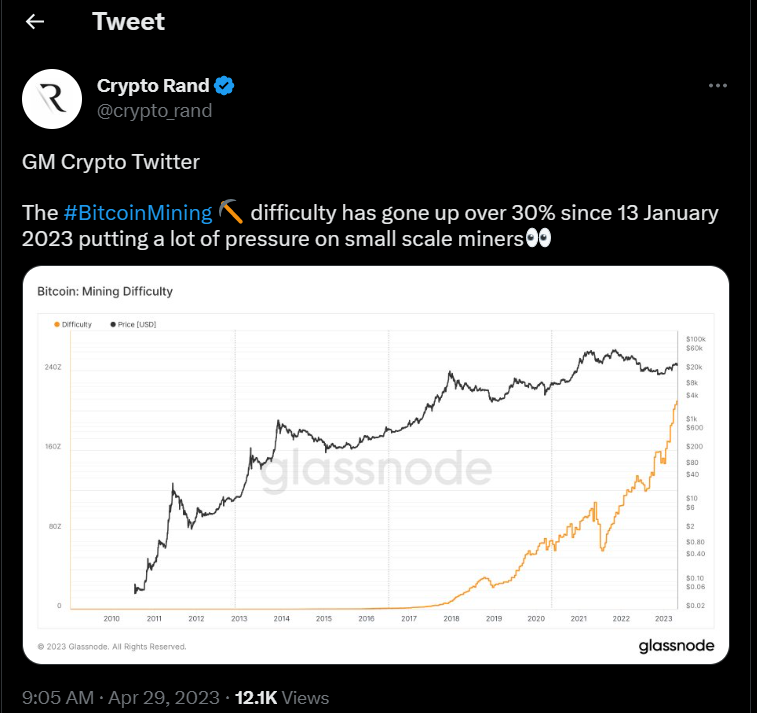 Trong một tin tức khác, nhà phân tích tiền điện tử nổi tiếng “Crypto Rand” gần đây đã báo cáo về sự gia tăng lớn về độ khó khai thác Bitcoin, đã tăng hơn 30% kể từ ngày 13 tháng 1 năm 2023. Các báo cáo khác cũng cho thấy độ khó khai thác Bitcoin đã đạt mức cao nhất mọi thời đại là 48,71 nghìn tỷ.