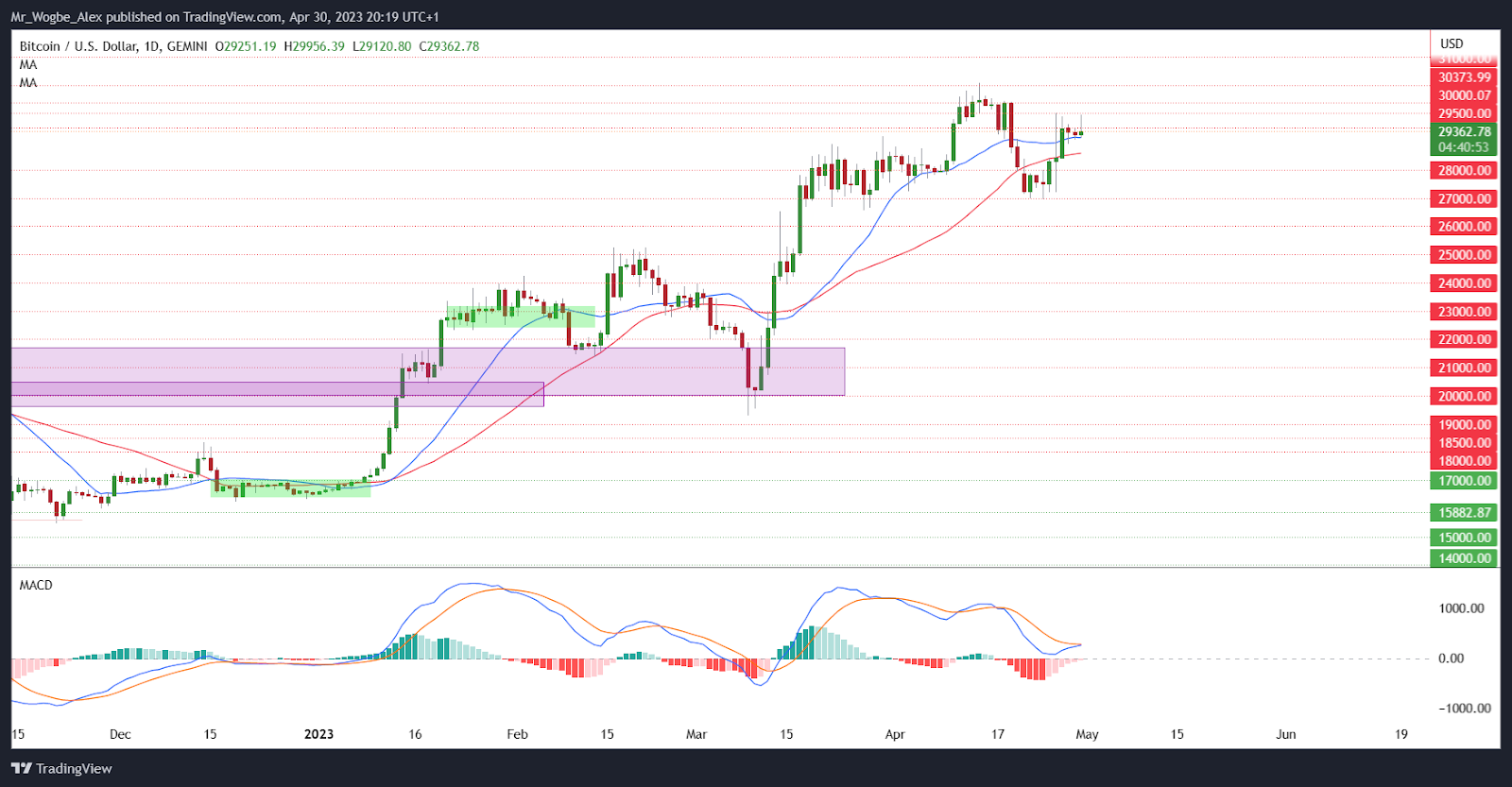 Như đã nhấn mạnh ngay từ đầu, Bitcoin đã ghi nhận tháng tăng giá thứ tư liên tiếp khi tâm lý thị trường được cải thiện theo tuần. Hiện tại, tiền điện tử chuẩn đang đấu tranh để lấy lại vị thế trên con số tròn 30.000 đô la khi chỉ báo MACD cho thấy rằng một làn sóng tăng giá đang đến gần.